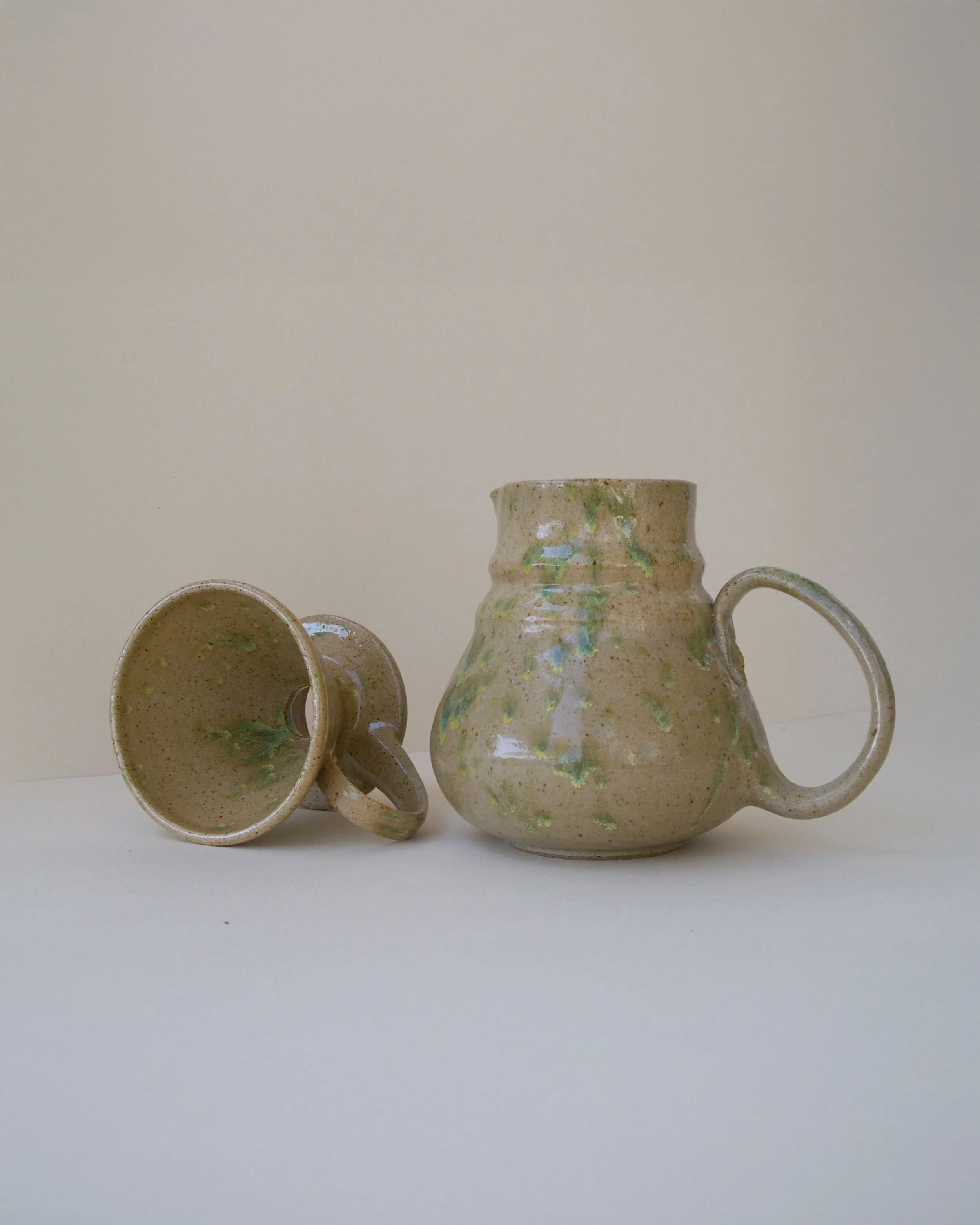 Elevate your coffee making experience with this statement pour over set. The ‘insulated’ carafe is a closed form with an inner and outer wall, and air gap in between to keep your coffee toasty . Clear glaze showcases the natural clay body.